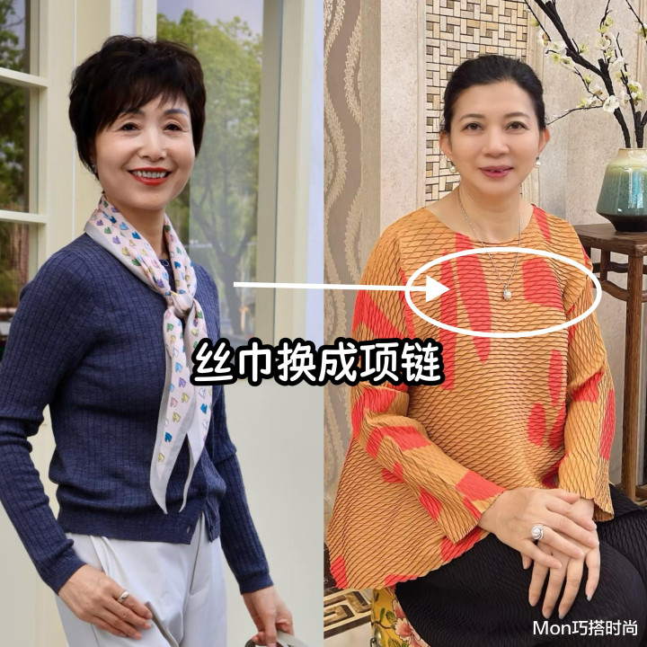 脖子空落落的时候,咱们不一定要戴丝巾,换成项链就很合适,既能填补留白,还很精致。但项链也不能选太粗太夸张的金项链或者翡翠项链,细一点的珍珠项链、银项链就很显气质,还可以帮我们修饰肩颈的线条。
