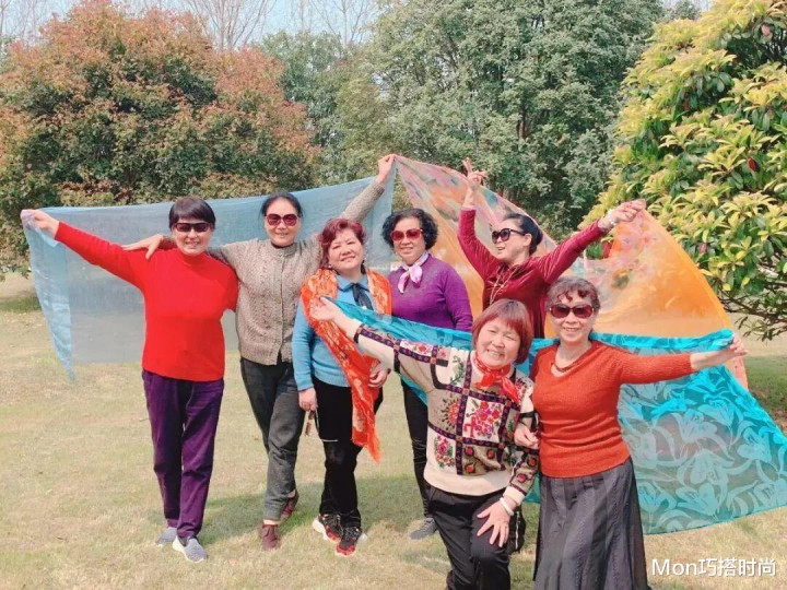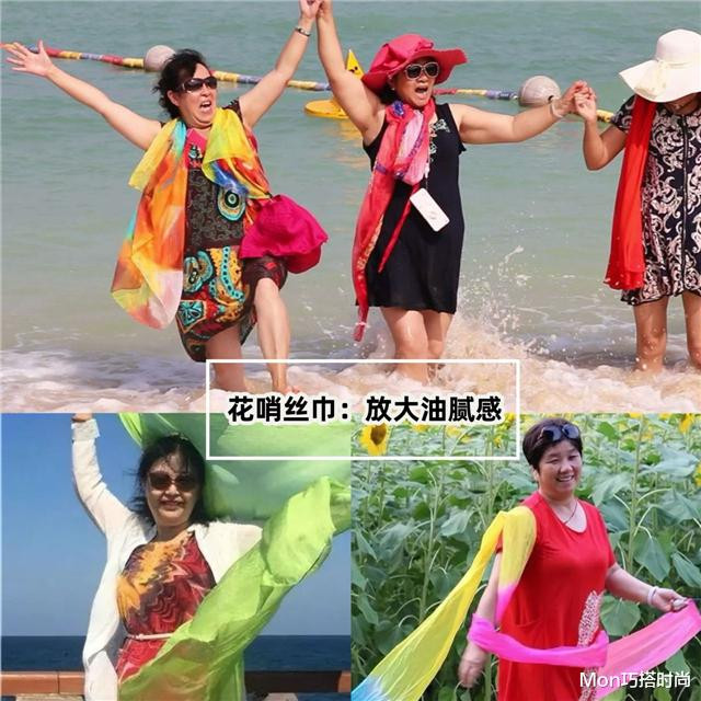 中国大妈的拍照标配配饰,绝对离不开丝巾,不管是站在海边、公园还是景区门口,总能看到阿姨们把丝巾往肩上一披,要么双手举着丝巾让风吹起来,要么把丝巾系在脖子上或者披在肩膀上,看着廉价花哨,直接把自己的形象拉低了,还十分抢镜。