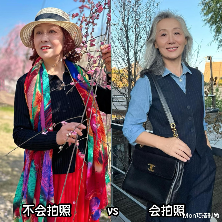 但扎心的是,每次刷到长辈们的旅行照,总觉得有点儿翻车,要么是穿得花花绿绿、要么是妆太浓,有的阿姨还特别爱披丝巾,结果拍出来的照片就成了中国大妈的标配景区游客照,一点美感都没有。