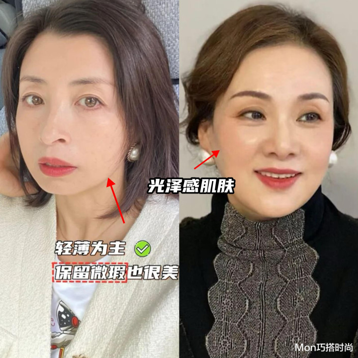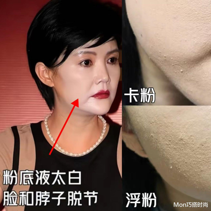 好多人化妆都以为越白越好看,选粉底液的时候就喜欢用最白的色号,结果拍照时脸和脖子像2个人的肤色,违和感拉满,上镜之后更是会放大色差感,还有的阿姨喜欢把底妆涂得厚厚的,结果不一会儿就开始卡粉、浮粉,脸上的痘痘、皱纹都被衬得明显了,看起来特别的显老,这样的化妆简直就是无效化妆。